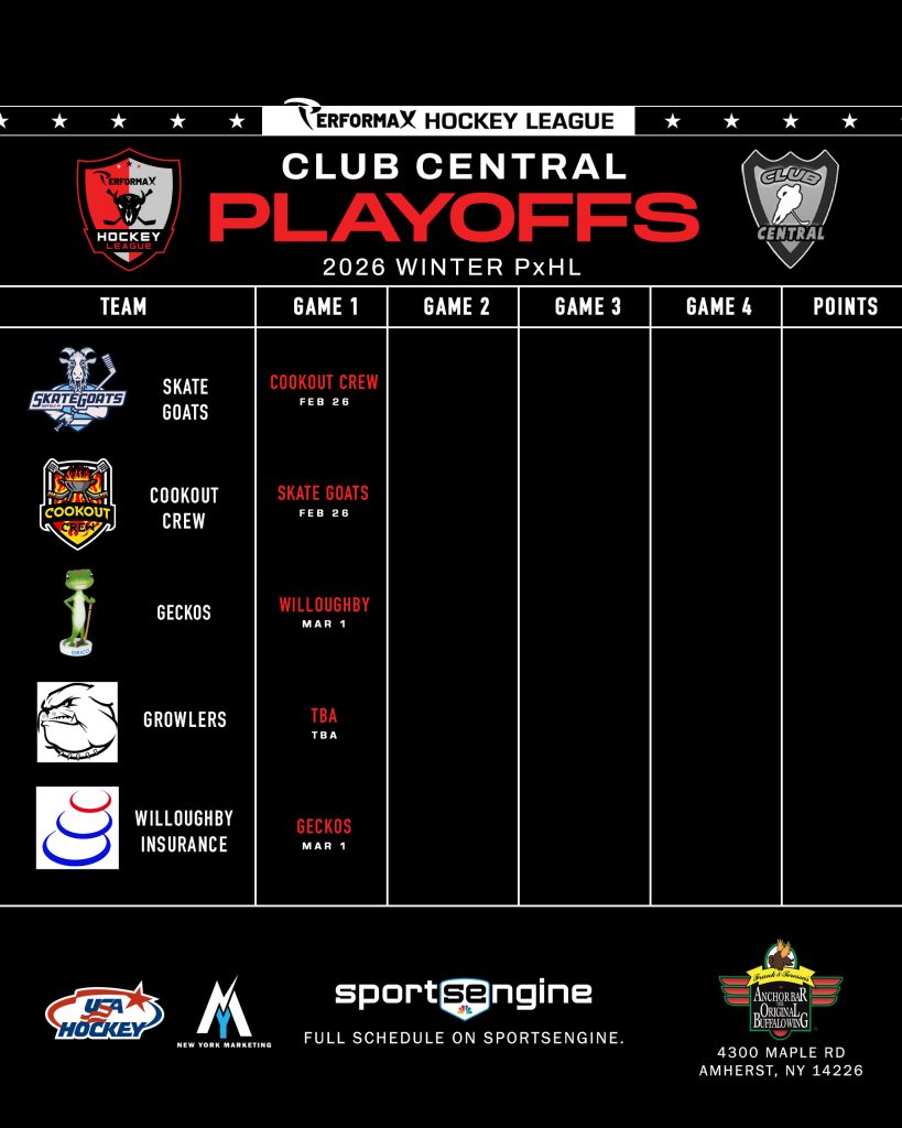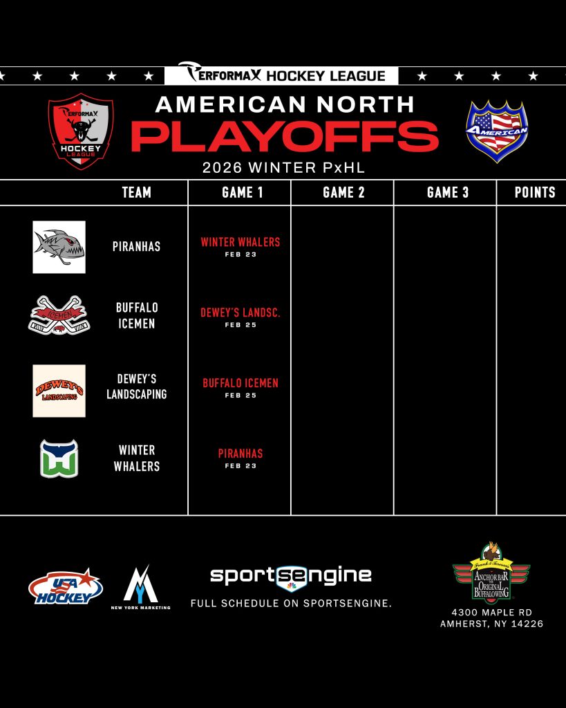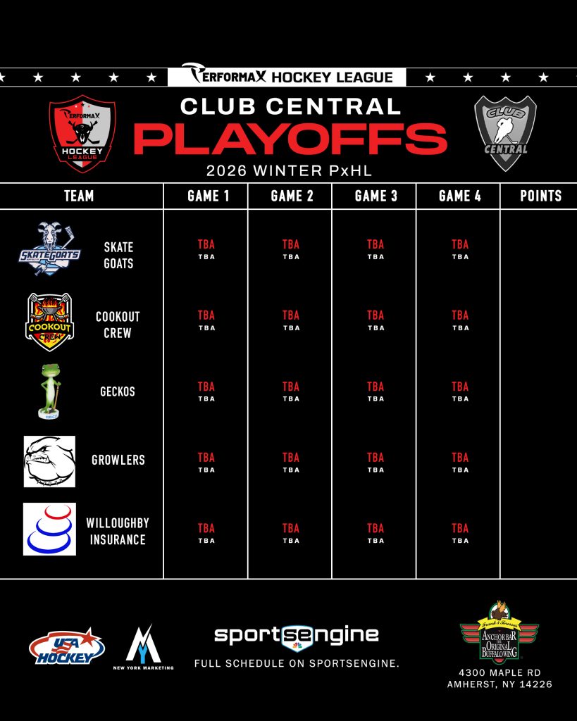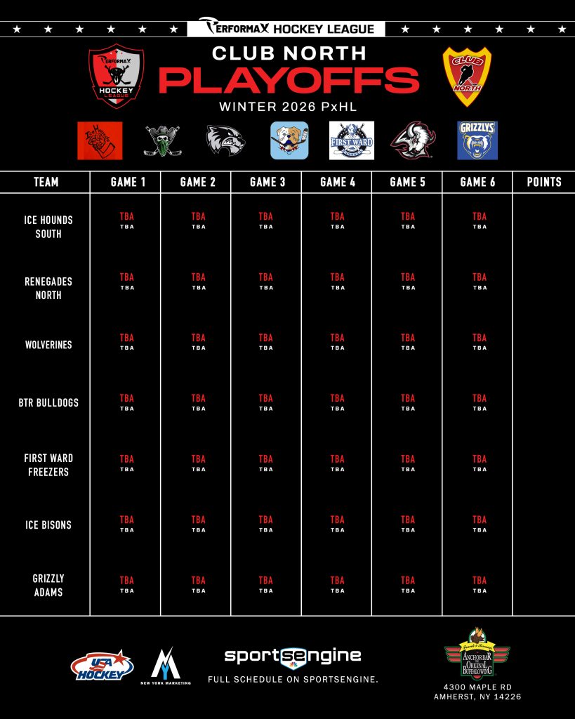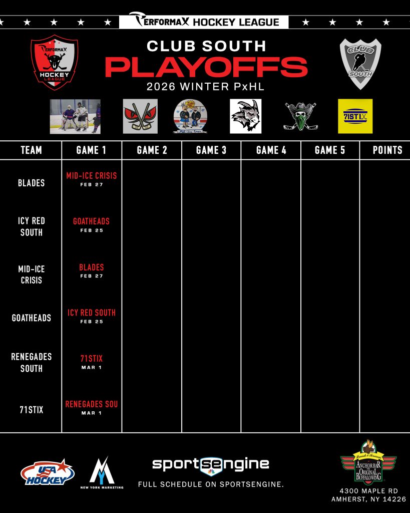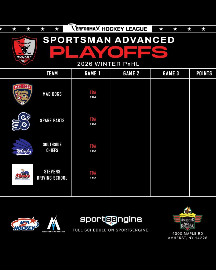 2026 Winter PxHL Playoffs (Click any image to enlarge. Tiebreakers 1 – Points2 – Wins (overall record)3 – Head to head (combined for teams tied)4 – Divisional record5 – Overall goal differential VIEW PAST YEARS