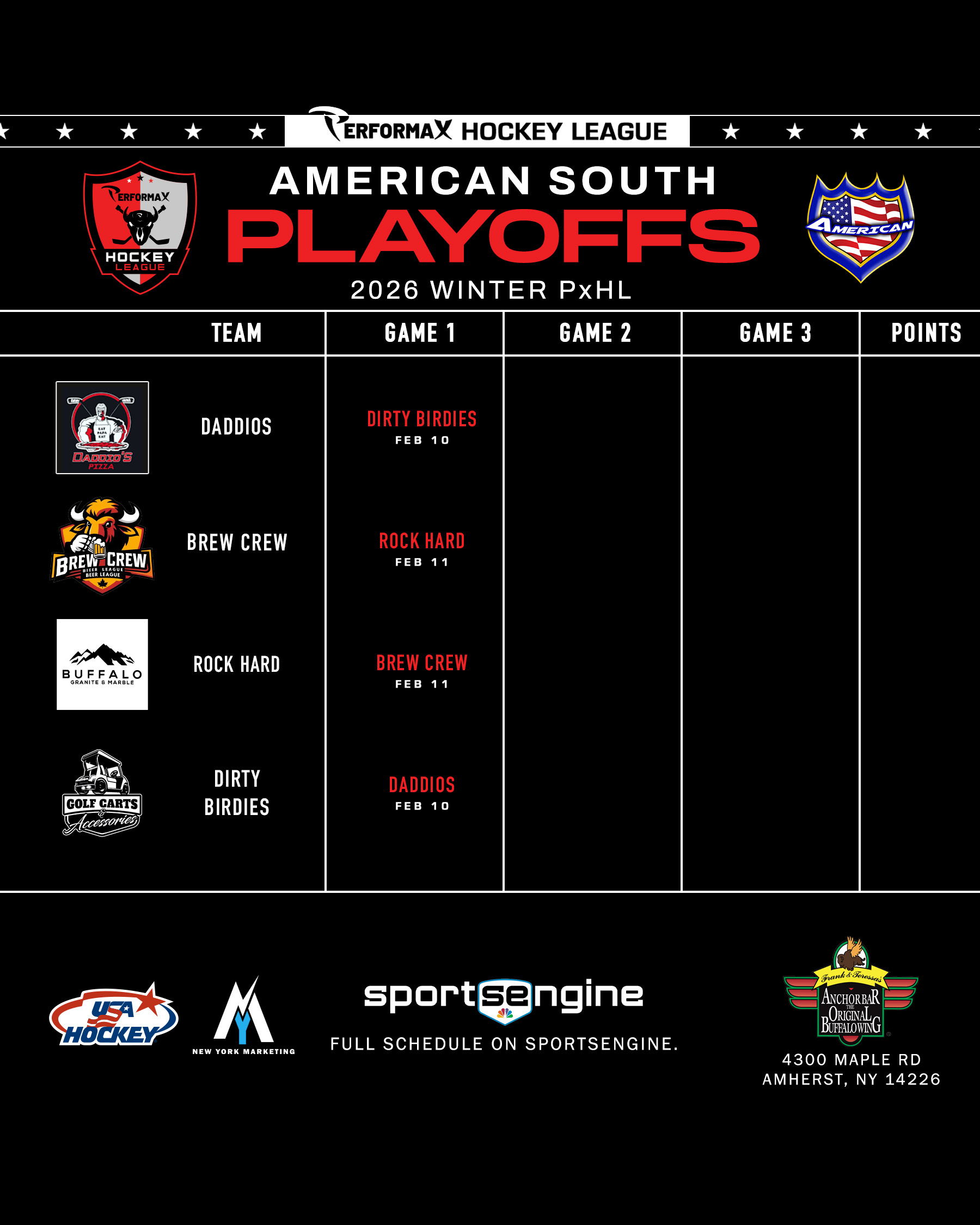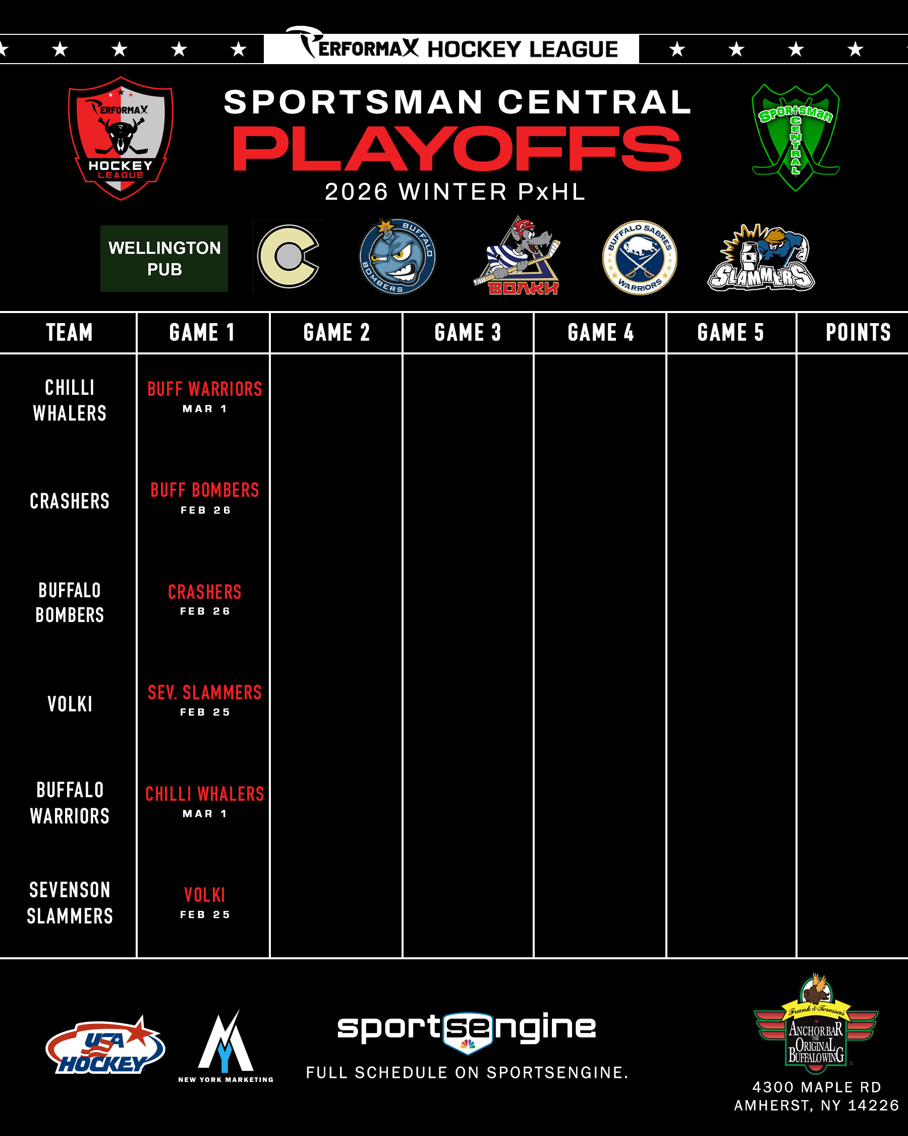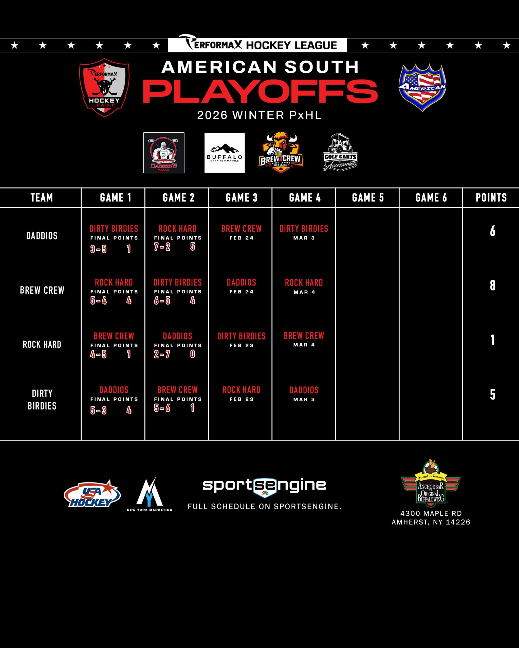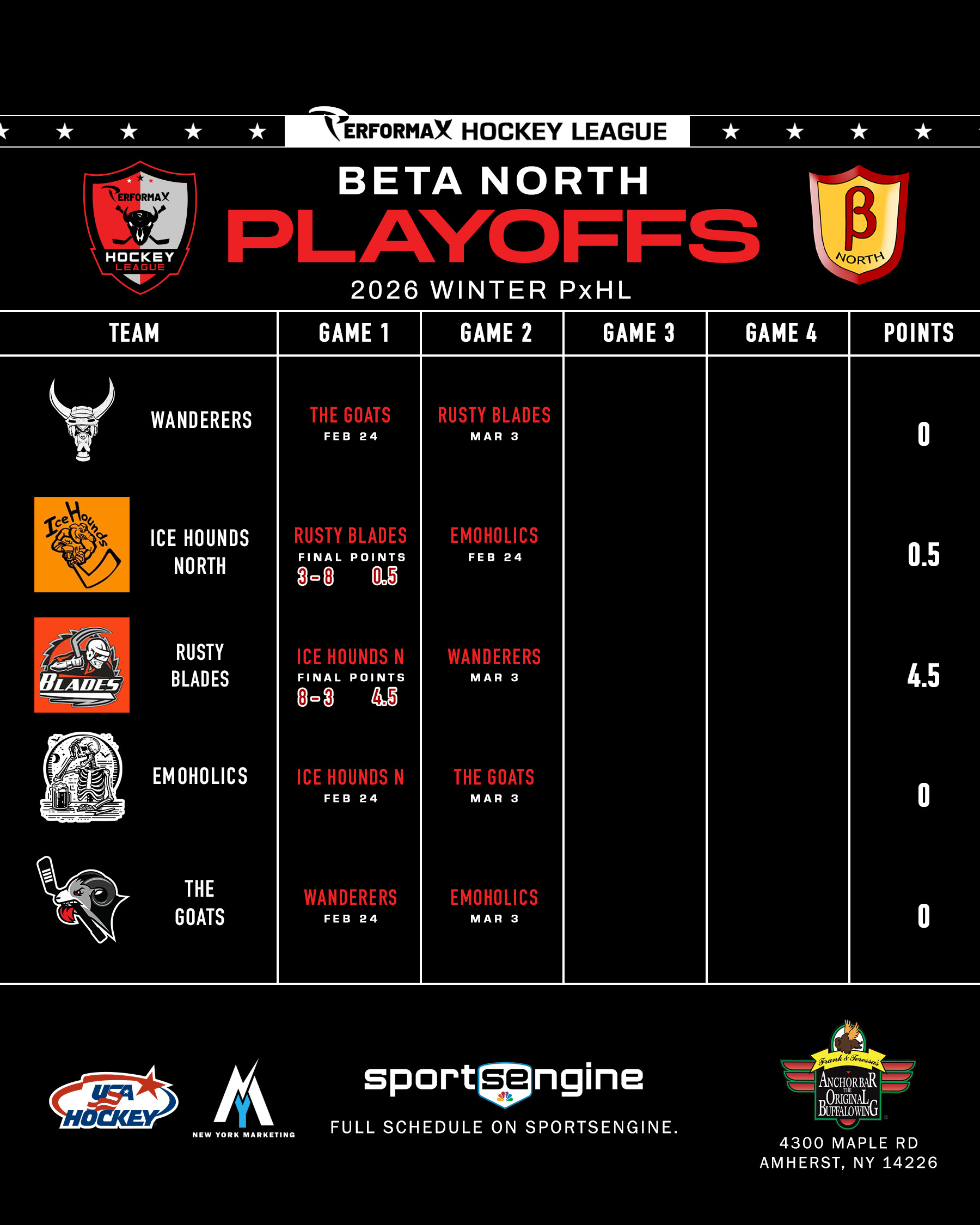 2026 Winter PxHL Playoffs (Click any image to enlarge. Tiebreakers 1 – Points2 – Wins (overall record)3 – Head to head (combined for teams tied)4 – Divisional record5 – Overall goal differential VIEW PAST YEARS